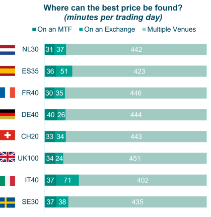 Within “lit” markets, there is little difference between primary exchanges and MTFs in the frequency at which they display a unique European Best Bid-Offer (EBBO) – suggesting that all lit venues make a similar contribution to price formation. In practice, for most of the trading day, the best available prices can be accessed from multiple venues, ensuring that price discovery is robust and competitive.