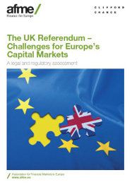 To help inform the debate surrounding the UK’s EU Referendum, AFME asked the leading law firm Clifford Chance to produce a report ‘The UK Referendum: Challenges for Europe’s Capital Markets: A legal and regulatory assessment’. This document provides a detailed, fact-based analysis of the issues European capital markets will face in the event of the UK leaving the EU.