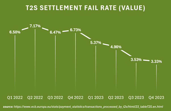 T2S – a common settlement platform to which 24 European CSDs are connected – also publish data on settlement fails. Again, this provides an incomplete picture, as not all CSDs are connected to T2S, but provides a reliable and consistent methodology that can be tracked over time. T2S data demonstrates a clear downward trend in settlement fails since the introduction of CSDR cash penalties in Q1 2022. Fail rates, measured in value, were 49% lower in Q4 2023 than in Q1 2022.