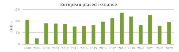 Of this, EUR 94.6 bn was placed, representing 44.4% of the total, compared to EUR 79.7 bn placed in 2022, representing 39.2% of the total.